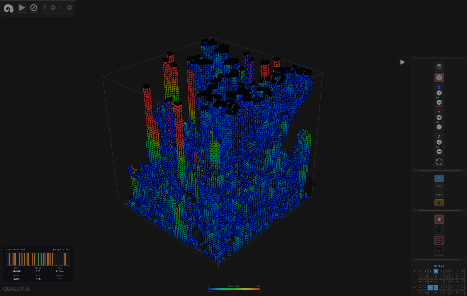 Spinram is a deterministic cellular automata compute engine designed to benchmark and compare three browser execution backends: JavaScript, WebAssembly, and WebGPU. The goal is controlled, reproducible performance measurement across runtimes.
